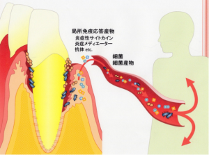 この潰瘍の表面から免疫細胞の攻撃を逃れた口腔内細菌が拡張した血管の中に侵入します。当然、血管内に侵入した口腔内細菌は、心臓の鼓動(1分間に50〜70回)に合わせ全身に伝播されます。全身を回った口腔内細菌は一部が全身の臓器に止まりそこで炎症を起こすなどの悪さをします。このことが継続していくと口腔内細菌が命を落とすような重篤な病気につながっていきます。
